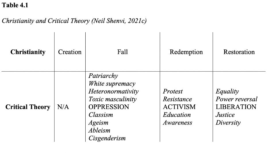 As a Christian, and as a mother, I know I need to share how critical theory contradicts what biblical scripture teaches us and how easily it can be mistaken for the Jesus centred Gospel Christians strive to share. Below (see Table 4.1) is a diagram copied from Neil Shenvi (2021c) which compares Christianity to Critical theory and clearly lays out how the two worldviews are distinct.