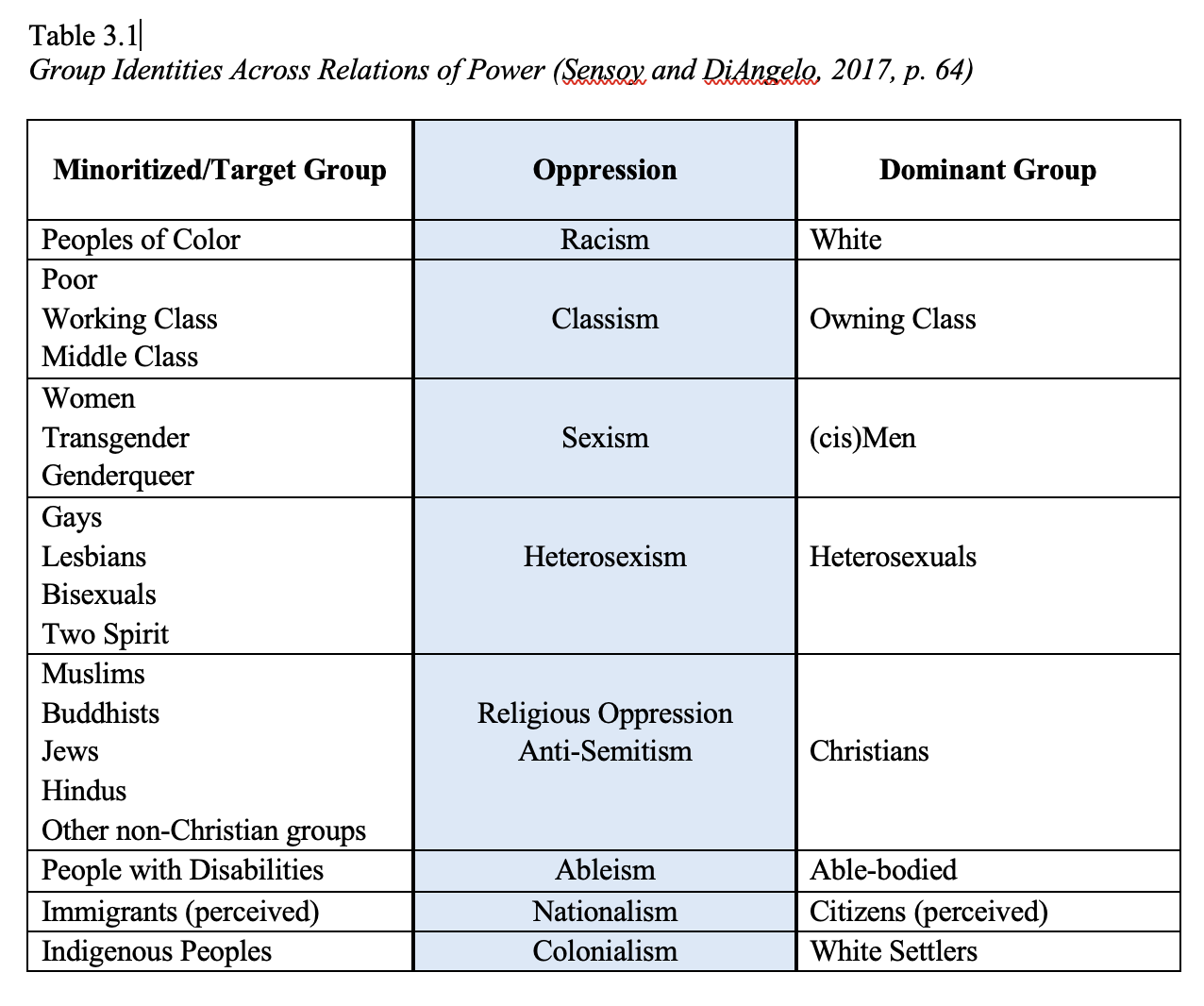 Critical theory identifies social groups as either oppressed or oppressing by believing they are binary: you are either in one group or another. A visual representation of this concept is in the table below (Table 3.1) which outlines various social descriptors that critical theorists use and the binary groups that are associated with each descriptor.
